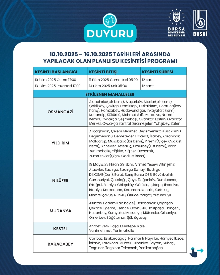 Söz konusu planlı su kesintileri, günlük 12 saati geçmemek kaydıyla, merkez ilçelere bağlı mahallelerde dönüşümlü olarak uygulanacaktır. Yapılması planlanan su kesintileri ile günlük 100 bin metreküp su tasarrufu yapılması hedeflenmektedir. Planlı su kesintilerinden Uludağ Üniversitesi, Şehir Hastanesi ve Devlet Hastaneleri etkilenmeyecektir.