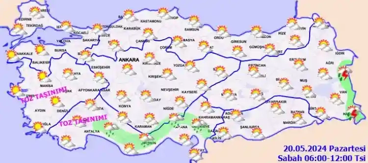 Meteoroloji haftanın ilk gününe ilişkin hava tahmin raporunu yayımladı. Marmara'nın güneyi ile Ege ve Batı Akdeniz'de toz taşınımı beklendiğinden; görüş mesafesinde düşme, hava kalitesinde azalma ve ulaşımda aksamalar gibi olumsuzluklara karşı dikkatli ve tedbirli olunması istendi.