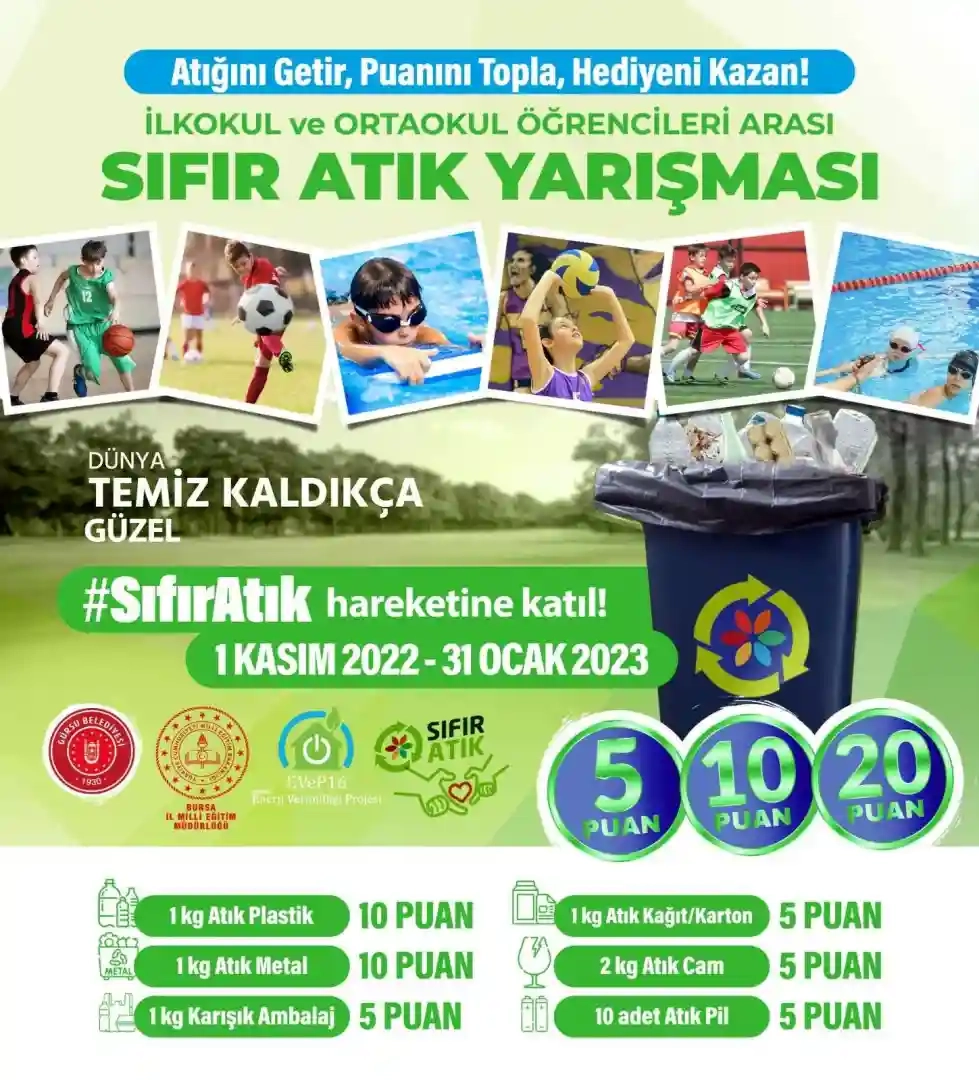 Gürsu Belediyesi’nin dünyanın doğasının korunmasına ve geri dönüşüme duyarlı nesiller yetişmesine katkı sağlamak amacıyla başlattığı uygulamada, Gürsu Belediyesi Kültür İşleri Müdürlüğü’nce bilet ve ulaşım olanağı sunulan çocuklar her hafta tiyatro ya da sinema filmi izleme olanağı buluyor. Gürsu Belediyesi’nin “Dünya temiz kaldıkça güzel”, “Sıfır atık hareketine katıl” sloganlarıyla başlattığı geri dönüşüm hareketi çerçevesinde ayrıca çocuklara yönelik “Atığını getir, puanını topla, hediyeni kazan” sloganıyla sıfır atık yarışması düzenleniyor. Kampanya tarihleri arasında toplanan atığın türüne ve miktarına göre kazanılan puanlar ile 100 puan toplayan öğrenci, Gürsu Belediyesi Kültür İşleri Müdürlüğü'nün düzenlediği futbol, basketbol, voleybol veya yüzme kurslarından herhangi birine bir aylık ücretsiz katılım hediyesi kazanacak. 444 3 616 Alo Atık Hattı’ndan Gürsu Belediyesi’ne ulaşan vatandaşlar, kampanyalara katılma koşulları hakkında detaylı bilgi edinebilir.