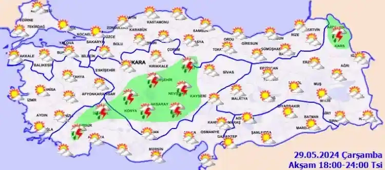 Meteoroloji Genel Müdürlüğü tarafından yapılan son değerlendirmelere göre: Ülkemiz genelinin parçalı yer yer çok bulutlu, Trakya Kesimi, Batı Akdeniz'in iç kesimleri ile Toroslar Mevkii, İç Anadolu (Eskişehir dışında), Orta Karadeniz, Kastamonu, Artvin, Ardahan, Kars ve Hakkari çevreleri ile Rize ve Trabzon'un iç kesimlerinin yerel sağanak ve gök gürültülü sağanak yağışlı geçeceği tahmin ediliyor.