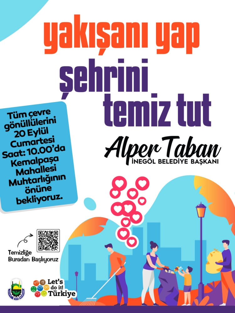 20 Eylül Cumartesi günü 10.00’da Belediye Başkanı Alper Taban, İnegöl Belediyesi temizlik personelleri, Let’s Do It Türkiye gönüllüleri ve vatandaşlarla birlikte Kemalpaşa Mahallesinde muhtarlık arkasındaki park ile çevre cadde ve sokaklarda temizlik yapılacak. Burada vatandaşlara aynı zamanda kirletmemenin önemi vurgulanacak.