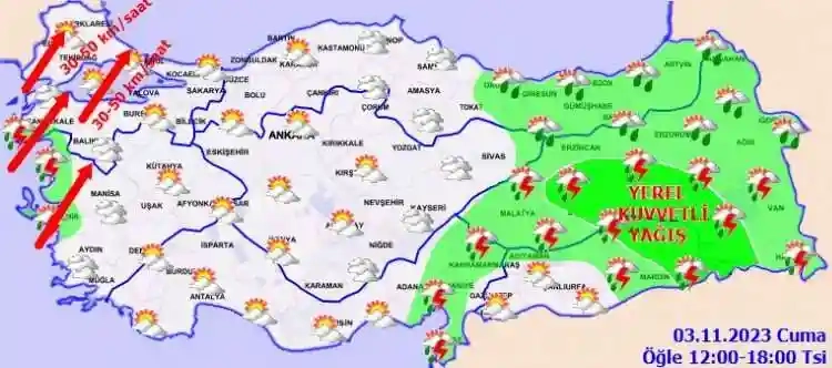 KUVVETLİ RÜZGAR UYARISI : Rüzgarın; Marmara, Kuzey Ege ve Kıyı Ege'de güney yönlerden kuvvetli (40-60 km/saat) yer yer kısa süreli fırtına (60-70 km/saat) şeklinde esmesi beklendiğinden meydana gelebilecek olumsuzluklara karşı dikkatli ve tedbirli olunmalıdır.