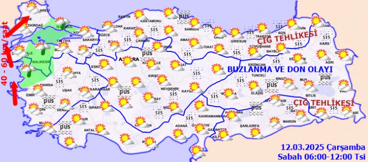 Gece ve sabah saatlerinde doğu bölgelerde buzlanma ve don olayı, Doğu Karadeniz'in iç kesimleri ile Doğu Anadolu'nun yüksek ve eğimli yamaçlarında çığ tehlikesi bulunduğundan heyelan, ulaşımda aksamalar ve kar erimesine bağlı olumsuzluklara karşı ilgililerin ve vatandaşlarımızın dikkatli ve tedbirli olmaları gerekmektedir.