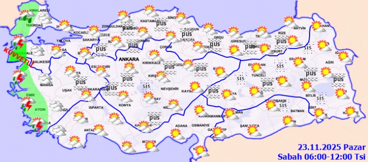 Meteoroloji Genel Müdürlüğü, 23 Kasım Pazar gününe ilişkin hava tahmin raporunu yayımladı. Yapılan son tahminlere göre Türkiye'nin kuzey, iç ve batı kesimlerinde parçalı, yer yer çok bulutlu bir hava hakim olacak.