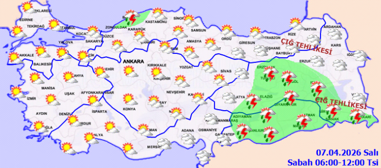 Meteoroloji Genel Müdürlüğü, 7 Nisan Salı gününe ilişkin hava tahmin raporunu yayımladı. Yapılan son değerlendirmelere göre, Marmara'nın kuzey ve doğusu, Doğu Akdeniz'in doğusu, İç Anadolu'nun kuzey ve doğusu, Karadeniz, Doğu ve Güneydoğu Anadolu ile Antalya'nın iç kesimleri ve Kütahya çevrelerinin aralıklı sağanak ve gök gürültülü sağanak, Doğu Anadolu'nun yüksek kesimlerinin karla karışık yağmur ve yer yer kar yağışlı geçeceği, yağışların Güneydoğu Anadolu'nun doğusu ile Osmaniye çevrelerinde yer yer kuvvetli olacağı tahmin ediliyor.