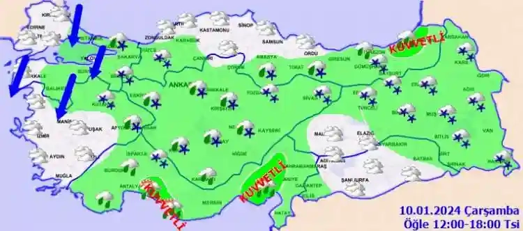 KUVVETLİ YAĞIŞ UYARISI: Yağışların: Marmara'nın doğusunun yüksekleri, Doğu Akdeniz ile Çanakkale'nin doğusu, Balıkesir'in kuzeyi, Antalya'nın doğusu, Bolu ve Düzce'nin yüksekleri, Rize, Artvin, Kilis, Gaziantep ve Şanlıurfa çevrelerinde yerel olmak üzere kuvvetli yağmur ve yükseklerde kuvvetli karlakarışık yağmur ve kar yağışı beklendiğinden yaşanabilecek ulaşımda aksamalar, su baskını buzlanma ve don gibi olumsuzluklara karşı dikkatli ve tedbirli olunmalıdır.