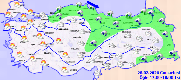 Meteoroloji Genel Müdürlüğü olarak yapılan değerlendirmelere göre: Yurdun kuzey, iç ve doğu kesimlerinin parçalı ve çok bulutlu, Marmara'nın kuzeydoğusu, İç Anadolu'nun doğusu, Karadeniz, Doğu Anadolu'nun kuzey ve doğusu ile Batman, Mardin, Siirt ve Diyarbakır doğu ilçelerinin yağışlı, diğer yerlerin az bulutlu geçeceği tahmin ediliyor. Samsun ve Ordu çevrelerinde kuvvetli olması beklenen yağışların genellikle karla karışık yağmur ve kar, kıyı kesimlerde yağmur şeklinde olacağı tahmin ediliyor. Gece ve sabah saatlerinde iç ve doğu bölgelerde buzlanma ve don olayı bekleniyor. Doğu Karadeniz’in iç kesimlerinin yüksekleri ile Doğu Anadolu’nun doğusunda yüksek kar örtüsüne sahip eğimli kesimlerinde çığ tehlikesi bulunmaktadır.