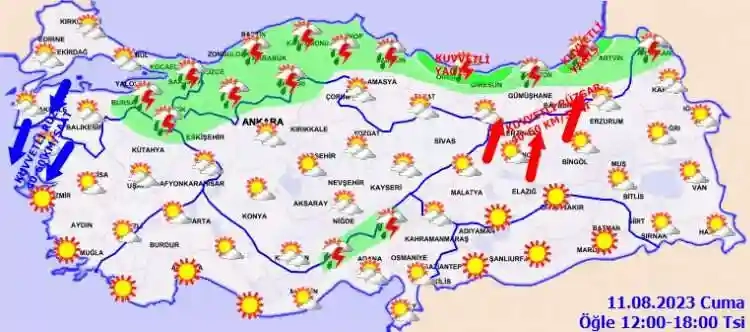 Meteoroloji Genel Müdürlüğü tarafından yapılan son değerlendirmelere göre: Ülkemizin kuzey kesimleri ile Doğu Akdeniz’in parçalı, yer yer çok bulutlu, Marmara’nın doğusu, Batı Karadeniz, Orta ve Doğu Karadeniz kıyıları, Osmaniye, Kütahya, Eskişehir, Çankırı ve Ardahan çevreleri, Hatay’ın kıyı kesimleri, Adana’nın kuzey ve doğusu ile Ankara’nın kuzey çevrelerinin yerel olmak üzere sağanak ve gök gürültülü sağanak yağışlı, diğer yerlerin az bulutlu ve açık geçeceği tahmin ediliyor. Yağışların Batı Karadeniz kıyıları, Sakarya, Kastamonu, Ordu, Giresun ve Rize çevreleri ile Artvin’in kıyı kesimlerinde yer yer kuvvetli olması bekleniyor.