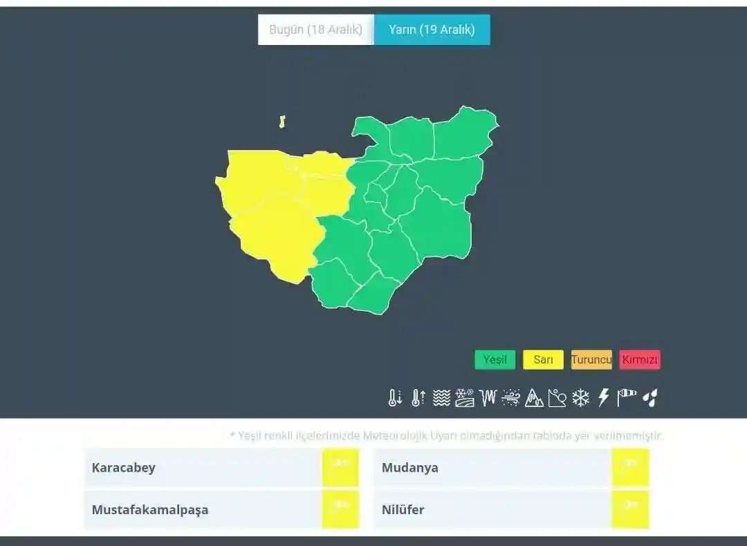 "Mustafakemalpaşa, Nilüfer, Mudanya ve Karacabey ilçelerinde bu gece 04.00'dan başlayıp salı günü saat 23.59'a kadar sürmesi kuvvetli rüzgar beklenmektedir. Kuzey ve kuzeydoğu yönlerden kuvvetli rüzgar ve kısa süreli fırtına (50-70 kilometre/saat) beklendiğinden başta ulaşımda aksamalar olmak üzere meydana gelebilecek olumsuzluklara karşı dikkatli ve tedbirli olunmalıdır."