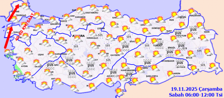 Sabah ve gece saatlerinde Marmara'nın doğusu, İç Ege, Akdeniz’in iç kesimleri, İç Anadolu, Karadeniz’in iç kesimleri, Doğu Anadolu ile Güneydoğu Anadolu'nun kuzey kesimlerinde pus ve yer yer sis bekleniyor.