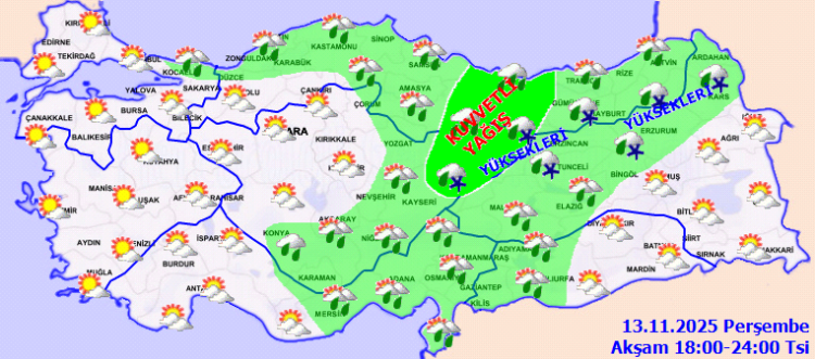 Doğu Karadeniz’in iç kesimlerinin yüksekleri ile Doğu Anadolu’nun kuzey kesimlerinin yükseklerinde karla karışık yağmur ve yer yer kar yağışı görülebilecek.