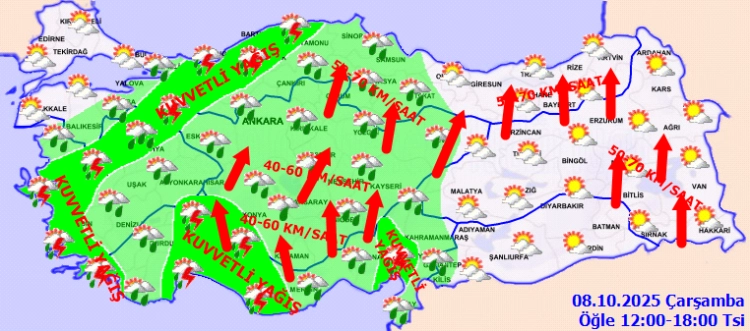 Yağışların; İzmir, Muğla, Aydın, Manisa, Kütahya, Sakarya, Bilecik, Bursa'nın doğusu, Isparta, Burdur, Bolu, Karabük, Zonguldak, Bartın, Düzce, Anamur, Osmaniye çevreleri ile Adana'nın doğu, Hatay'ın kıyı kesimlerinde kuvvetli, Antalya'nın doğu ilçelerinde yerel şiddetli ve aşırı olması bekleniyor.