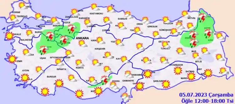 Meteoroloji Genel Müdürlüğü tarafından yapılan son değerlendirmelere göre: Ülkemizin kuzey ve iç kesimleri yer yer parçalı bulutlu, öğle saatlerinden sonra Doğu Akdeniz'in Toroslar mevkii ile Erzurum, Kars, Ardahan, Bolu, Sakarya'nın güneyi, Bursa'nın doğusu, Eskişehir, Bilecik ve Kütahya çevreleri yerel sağanak ve gök gürültülü sağanak yağışlı, diğer yerlerin açık geçeceği tahmin ediliyor.