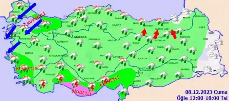 KUVVETLİ YAĞIŞ UYARISI: Yapılan son değerlendirmelere göre; Marmara'nın doğusu, Ege , Akdeniz, Doğu Anadolu'nun güneybatısı ile Çanakkale'nin doğusu, Diyarbakır ve Adıyaman çevrelerinde kuvvetli (21-50 kg/m2), Mersin ve Adana'nın güney kesimlerinde yer yer çok kuvvetli (21-75 kg/m2), Antalya’nın doğusunda çok kuvvetli ve yer yer şiddetli (51-100 kg/m2) sağanak ve gök gürültülü sağanak yağış bekleniyor. Yağışların Antalya’nın doğusunun 1500 m üzeri yüksek kesimlerinde (özellikle Antalya-Konya yolunun Alacabel mevkiinde) kuvvetli karla karışık yağmur ve kar şeklinde olması bekleniyor. Kuvvetli yağışlarla birlikte sel, su baskını, yıldırım, ulaşımda aksamalar, yağış anında kuvvetli rüzgar, yerel dolu yağışı gibi olumsuzluklara karşı dikkatli ve tedbirli olunmalıdır.