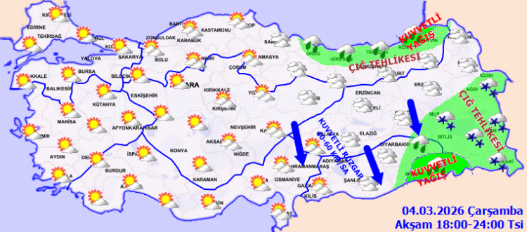 Yağışların; Doğu Karadeniz kıyıları, Ordu ve Artvin ile akşam saatlerinden itibaren Batman, Mardin, Siirt ve Şırnak çevrelerinde yer yer kuvvetli olması beklendiğinden yaşanabilecek olumsuzluklara karşı dikkatli ve tedbirli olunması gerekmektedir.