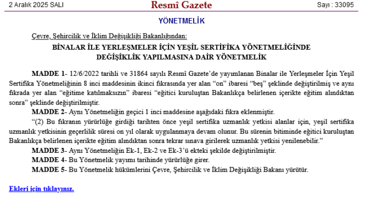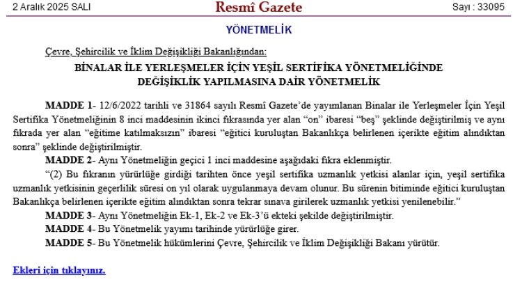 Çevre Şehircilik ve İklim Değişikliği Bakanlığı, "Binalar ile Yerleşmeler İçin Yeşil Sertifika Yönetmeliği'nde Değişiklik Yapılmasına Dair Yönetmeliği" bugünkü Resmi Gazete'de yayımladı.