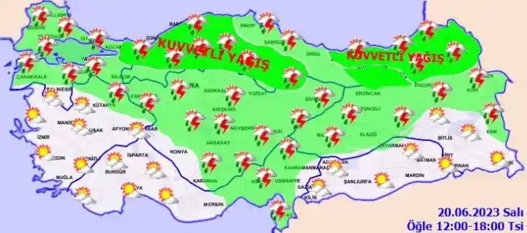 Meteoroloji Genel Müdürlüğü tarafından yapılan son değerlendirmelere göre: Ülkemiz genelinin parçalı ve çok bulutlu, Marmara, Doğu Akdeniz, İç Anadolu, Karadeniz, Doğu Anadolu’nun kuzey ve batısı ile Afyonkarahisar, Kütahya çevreleri ve Diyarbakır'ın kuzey ve batı çevrelerinin sağanak ve gök gürültülü sağanak yağışlı geçeceği tahmin ediliyor. Yağışların; Karadeniz(Sinop hariç) Sakarya, Çankırı, Ardahan, Kars çevreleri ile Erzurum'un kuzey kesimlerinde yerel kuvvetli; Trabzon, Rize, Artvin, Sakarya, Düzce, Zonguldak, Bartın ve Kastamonu’nun kuzeybatısında çok kuvvetli ve şiddetli olması tahmin ediliyor.