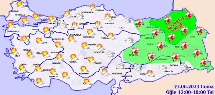 Ülkemizin kuzey, iç ve doğu kesimlerinin parçalı ve yer yer çok bulutlu, Doğu Karadeniz, Doğu Anadolu (Şırnak hariç) ile Samsun'un doğusu, Ordu, Tokat ve Diyarbakır çevrelerinin yerel olmak üzere aralıklı sağanak ve gök gürültülü sağanak yağışlı, diğer yerlerin az bulutlu ve açık geçeceği tahmin ediliyor. Yağışların Doğu Karadeniz kıyıları, Doğu Anadolu'nun kuzey doğusu ile Artvin çevrelerinde kuvvetli, Trabzon ve Erzurum çevreleri ile Rize'nin batı, Bingöl'ün kuzey kesimlerinde yer yer çok kuvvetli ve şiddetli olması bekleniyor.