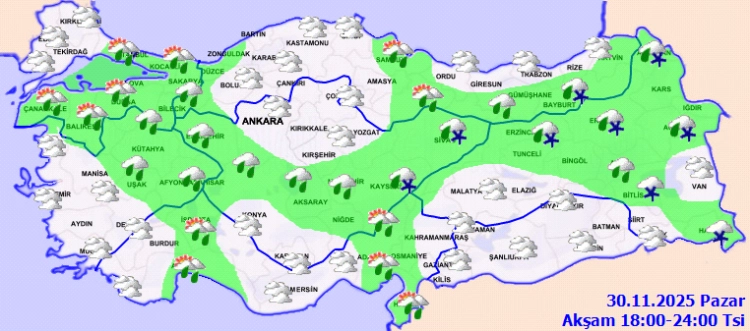 İç Anadolu’nun doğusu, Doğu Anadolu’nun kuzey ve doğusu ile Doğu Karadeniz’in yüksek kesimlerinde yağışların yer yer karla karışık yağmur ve kar şeklinde olması bekleniyor.