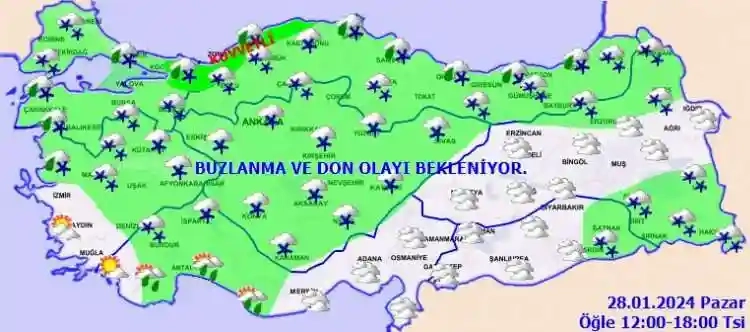 Ülkemiz genelinin parçalı ve çok bulutlu, Marmara, İç Ege, Batı Akdeniz, İç Anadolu, Karadeniz, Doğu Anadolu güney doğusu ile Erzurum, Kars, Ardahan, Batman, Mardin ve Siirt çevrelerinin kar yağışlı geçeceği tahmin ediliyor. Meteoroloji, buzlanma uyarısında da bulundu.