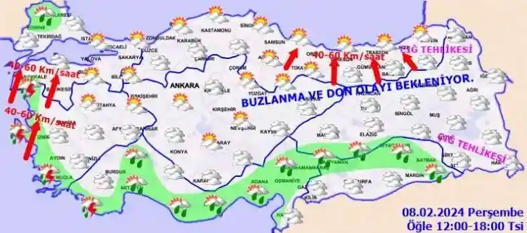 KUVVETLİ RÜZGÂR UYARISI: Rüzgârın, Marmara’nın güneybatısı, Doğu Karadeniz’in iç kesimlerinde güneyli yönlerden kuvvetli (40-60 km/saat) esmesi beklendiğinden yaşanabilcek olumsuzluklara karşı dikkatli ve tedbirli olunması gerekmektedir.