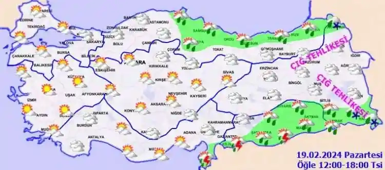 Ülkemiz genelinin parçalı yer yer çok bulutlu, Orta ve Doğu Karadeniz kıyı kesimi, Güneydoğu Anadolu Bölgesi, Hatay, Osmaniye ve Amasya çevrelerinin aralıklı yağmur ve sağanak, Ardahan, Bitlis, Hakkari çevreleri, Van'ın güneyi ve Şırnak'ın doğusunun karla karışık yağmur ve bu illerin yükseklerinin kar yağışlı geçeceği tahmin ediliyor. Yağışların bu sabah saatlerinde Hatay, Osmaniye ve Kilis çevrelerinde yerel kuvvetli olması bekleniyor. Doğu Karadeniz'in ve Doğu Anadolu'nun doğusunun yüksek ve karla kaplı kesimlerinde ve dik yamaçlarında çığ tehlikesi bulunmaktadır. İç kesimlerde sabah ve gece saatlerinde yer yer sis ve pus hadisesi bekleniyor.