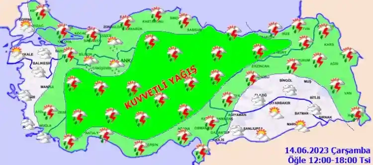Meteoroloji Genel Müdürlüğü tarafından yapılan son değerlendirmelere göre: Ülkemiz genelinin parçalı ve yer yer çok bulutlu, Marmara'nın kuzey ve doğusu, İç Ege, Akdeniz, İç Anadolu, Karadeniz, Doğu Anadolu'nun kuzey ve doğusu ile Muğla,Aydın'ın iç kesimleri, Malatya, G. Antep ve Adıyaman çevrelerinin yerel olmak üzere aralıklı sağanak ve gök gürültülü sağanak yağışlı geçeceği tahmin ediliyor. Yağışların Aksaray ve Giresun çevreleri ile zamanla Batı Akdeniz'in iç kesimleri, İç Anadolu (Eskişehir çevreleri ile Ankara'nın kuzeybatı kesimleri hariç), Orta Karadeniz, Doğu Karadeniz kıyıları ile Afyonkarahisar, Kütahya, Uşak, Denizli'nin doğusu, Adana ve Gümüşhane çevrelerinde yer yer kuvvetli olması bekleniyor.