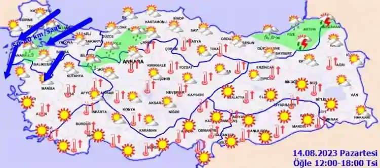 KUVVETLİ RÜZGAR UYARISI: Rüzgarın; Marmara'nın batısında ve Kuzey Ege'de kuzey ve kuzeydoğu yönlerden kuvvetli ve zaman zaman kısa süreli fırtına (50-80 km/saat) şeklinde eseceği tahmin edildiğinden yaşanabilecek olumsuzluklara karşı dikkatli ve tedbirli olunmalıdır.