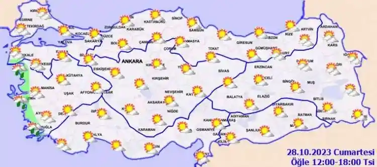 Meteoroloji Genel Müdürlüğü tarafından yapılan son değerlendirmelere göre: Ülkemizin batı kesimlerinin parçalı ve yer yer çok bulutlu, Kıyı Ege ile Kırklareli çevrelerinin yerel olmak üzere sağanak yağışlı, diğer yerlerin az bulutlu ve açık geçeceği tahmin ediliyor. Sabah ve gece saatlerinde iç kesimlerde yer yer pus ve sis bekleniyor.