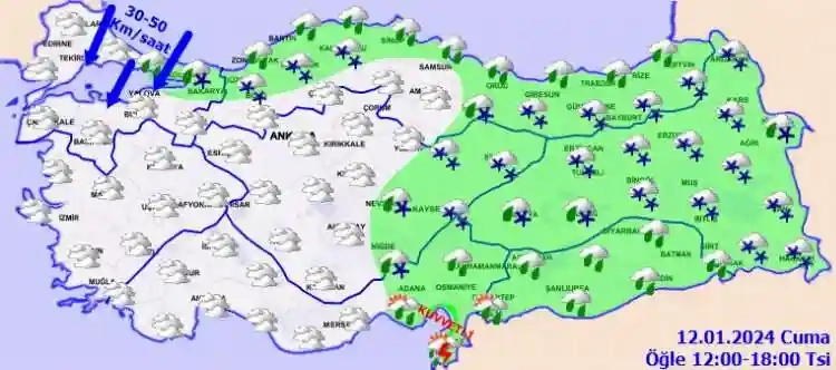 Çok bulutlu, aralıklı yağmurlu, iç kesimlerinin karla karışık yağmur ve yer yer kar yağışlı geçeceği tahmin ediliyor. Yağışların; akşam ve gece saatlerinde yerel kuvvetli olması bekleniyor.