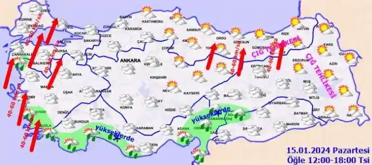 Meteoroloji Genel Müdürlüğü tarafından yapılan son değerlendirmelere göre: Ülkemiz genelinin parçalı ve yer yer çok bulutlu, Marmara'nın batısı, Güney ve Kıyı Ege. Akdeniz bölgesi ile Gaziantep, Adıyaman ve Kilis çevrelerinin yağışlı geçeceği tahmin ediliyor. Gece saatlerinde Kıyı Ege, Çanakkale'nin güney, Balıkesir'in batı kıyı kesimleri ile Antalya'nın batı ilçelerinde yer yer kuvvetli olması beklenen yağışların, genellikle yağmur ve sağanak, Toroslar Mevkii'nde karla karışık yağmur ve yer yer kar yağışı şeklinde olacağı tahmin ediliyor. Yurdun iç ve doğu kesimlerinde pus ve yer yer sis hadisesi bekleniyor. Doğu Karadeniz’in iç kesimleri ile Doğu Anadolu’nun kuzey ve doğusunda çığ tehlikesi bulunmaktadır.