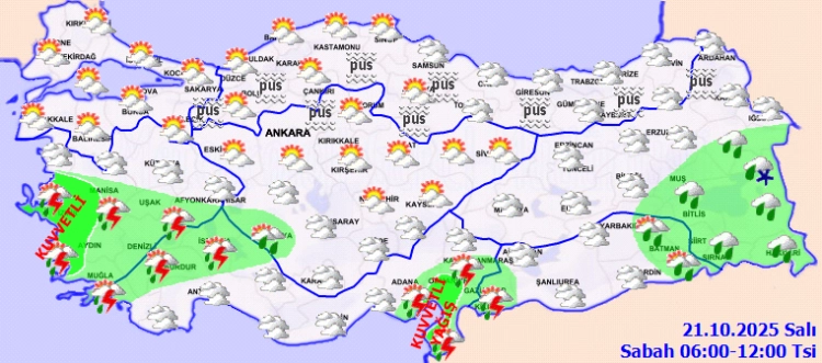 Türkiye yağışlı havanın etkisi altına giriyor. Meteoroloji Genel Müdürlüğü, 21 Ekim Salı gününe ilişkin yayımladığı hava tahmin raporuna göre, yurdun büyük bölümünde parçalı ve çok bulutlu bir hava bekleniyor.