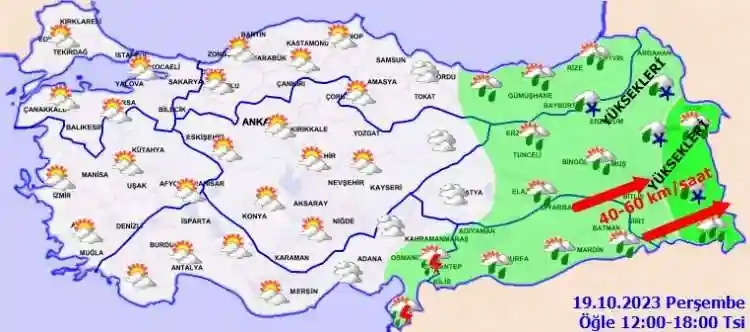 Ülkemiz genelinin parçalı ve çok bulutlu, Doğu Akdeniz, Doğu Karadeniz, Doğu ve Güneydoğu Anadolu ile İstanbul, Kayseri, Sivas ve Tokat çevrelerinin yağışlı geçeceği tahmin ediliyor. Yağışların, Doğu Karadeniz, Doğu Anadolu (Malatya hariç), Güneydoğu Anadolu'nun doğusunda kuvvetli, Trabzon, Rize ve Artvin çevrelerinde yer yer çok kuvvetli olmak üzere sağanak ve gök gürültülü sağanak, Doğu Karadeniz'in iç kesimlerinin yüksekleri ile Doğu Anadolu'nun doğu kesimlerinin yükseklerinde karla karışık yağmur ve yer yer kar şeklinde olması bekleniyor. Rüzgarın Doğu Anadolu’nun güneydoğusunda güney ve güneybatı yönlerden kuvvetli (40-60 km/saat) olarak eseceği tahmin ediliyor. Sabah saatlerinde iç kesimlerde yer yer pus ve sis hadisesi bekleniyor.