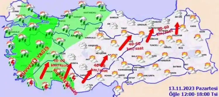 KUVVETLİ RÜZGAR UYARISI: Rüzgarın, Marmara'nın kuzeyi ile Batı ve Orta Karadeniz kıyılarında kuzeyli, Batı Akdeniz'in iç kesimleri, İç Anadolu’nun güney ve doğusu, Doğu Karadeniz’in iç kesimleri ile Doğu Anadolu’nun kuzeyinde güneyli yönlerden kuvvetli olarak (40-60 km/saat) esmesi beklendiğinden meydana gelebilecek olumsuzluklara karşı dikkatli ve tedbirli olunmalıdır.