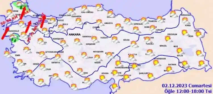 KUVVETLİ RÜZGÂR UYARISI: Rüzgârın; Marmara'nın batısında devam eden kuvvetli rüzgarın etkisini arttırarak Çanakkale, Edirne'nin güneyi ve İstanbul'un kuzey ilçelerinde güney ve güneybatı yönlerden kısa süreli fırtına (40-60, hamlesi 75 km/saat), Kırklareli'nin Demirköy ve Vize ilçelerinde kuvvetli fırtına (50-70, hamlesi 90 km/saat) şeklinde esmesi beklendiğinden ulaşımda aksamalar, çatı uçması, soba ve doğalgaz kaynaklı zehirlemeler gibi olumsuzluklara karşı dikkatli ve tedbirli olunmalıdır.