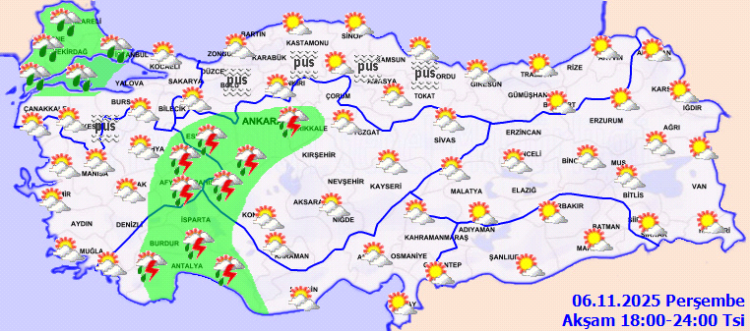 Meteoroloji Genel Müdürlüğü’nün değerlendirmelerine göre; Marmara’nın batısı, İç Ege, Batı Akdeniz, İç Anadolu’nun batısı ile Bursa, Kocaeli, Aydın, Muğla, Aksaray, Kırıkkale ve Kırşehir çevrelerinde aralıklı sağanak ve gök gürültülü sağanak yağış bekleniyor.