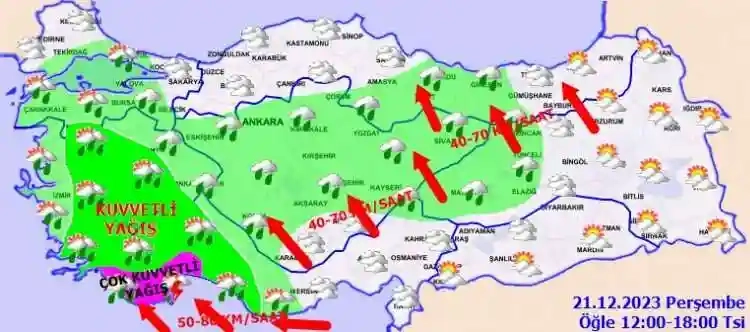 KUVVETLİ RÜZGAR UYARISI: Rüzgarın Orta ve Doğu Karadeniz'in iç kesimleri ile İç Anadolu'nun doğusunda kuvvetli (40 ila 70 km/saat), Batı ve Orta Akdeniz kıyılarında kuvvetli ve zaman zaman kısa süreli fırtına (50 ila 80, hamleli 90 km/saat) şeklinde esmesi beklendiğinden yaşanabilecek olumsuz şartlara karşı dikkatli ve tedbirli olunması gerekmektedir.