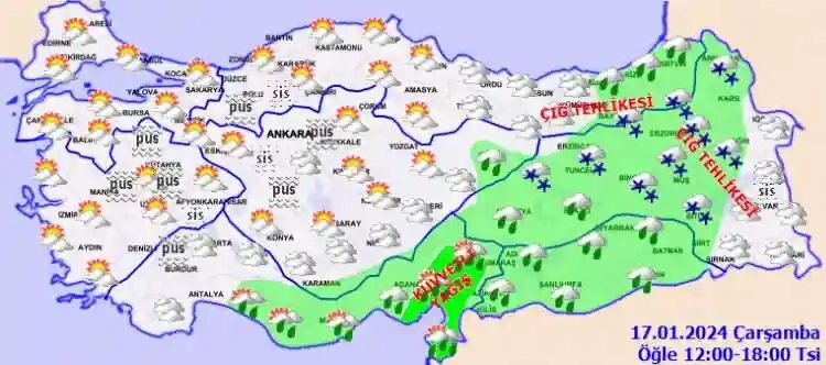 Meteoroloji Genel Müdürlüğü tarafından yapılan son değerlendirmelere göre: Ülkemiz genelinin parçalı ve çok bulutlu, Orta ve Doğu Akdeniz, İç Anadolu'nun güney ve doğusu, Orta ve Doğu Karadeniz (Samsun dışında), Doğu Anadolu’nun kuzey ve batısı, Güneydoğu Anadolu ile Antalya, Muş ve Bitlis çevrelerinin yağışlı geçeceği tahmin ediliyor. Yağışların, Osmaniye, Kahramanmaraş ve Hatay çevrelerinde kuvvetli, Antalya’nın doğu, Mersin’in batı kesimlerinde yer yer kuvvetli olması bekleniyor. Yağışların, genellikle yağmur ve sağanak, Doğu Karadeniz’in iç kesimleri, Doğu Anadolu’nun kuzeyi ile Muş ve Bitlis çevrelerinde karla karışık yağmur ve kar şeklinde olacağı tahmin ediliyor. İç ve batı kesimlerde pus ve sis, doğu kesimlerde buzlanma ve don olayı bekleniyor. Doğu Karadeniz’in iç kesimleri ile Doğu Anadolu’nun kuzey ve doğusunda çığ tehlikesi bulunmaktadır.