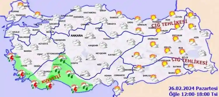 Meteoroloji Genel Müdürlüğü olarak yapılan son değerlendirmelere göre: Ülkemiz genelinin parçalı ve yer yer çok bulutlu, Güney Ege kıyıları, (Burdur hariç) Batı Akdeniz ile Mersin, Karaman, Niğde ve Aksaray çevrelerinin sağanak ve yer yer gök gürültülü sağanak yağışlı geçeceği tahmin ediliyor. Yağışların, Muğla'nın kıyı kesimleri ile Antalya il merkezi ve batı kıyılarında yerel kuvvetli olması bekleniyor. Doğu Karadeniz’in iç kesimleri ile Doğu Anadolu’nun kuzey ve doğusunda yüksek kar örtüsü bulunan yerlerde çığ tehlikesi bulunmaktadır. Sabah ve gece saatlerinde kuzey ve doğu kesimlerde pus ve yer yer sis bekleniyor.