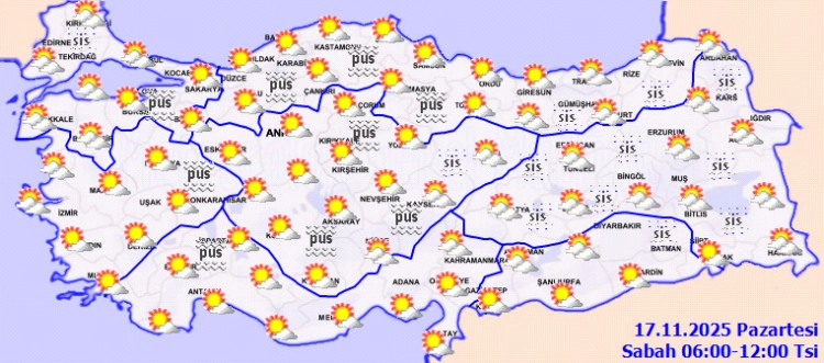 Meteoroloji'nin 17 Kasım Pazartesi gününe ilişkin hava tahmin raporuna göre, yurdun genelinde yağış beklenmiyor. Sabah ve gece saatlerinde Trakya, İç Ege, Akdeniz’in iç kesimleri, İç Anadolu'nun güney ve doğusu, Karadeniz'in iç kesimleri, Doğu Anadolu ile Güneydoğu Anadolu'nun kuzeyinde pus ve yer yer sis bekleniyor.