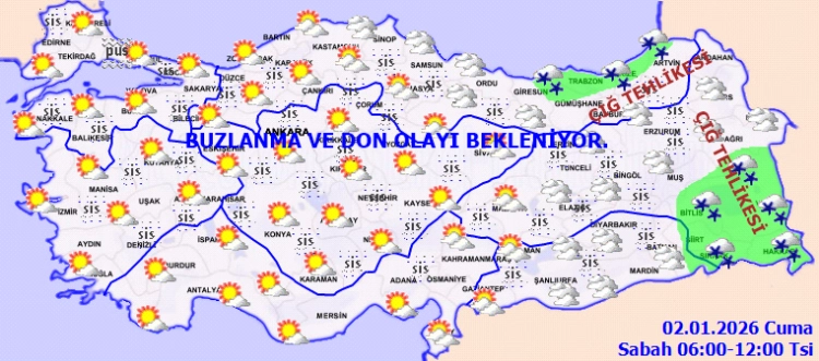 İç ve doğu bölgelerde buzlanma ve don olayı beklenirken, Doğu Karadeniz’in yüksekleri ile Doğu Anadolu’nun doğusundaki eğimli alanlarda çığ tehlikesi bulunuyor.