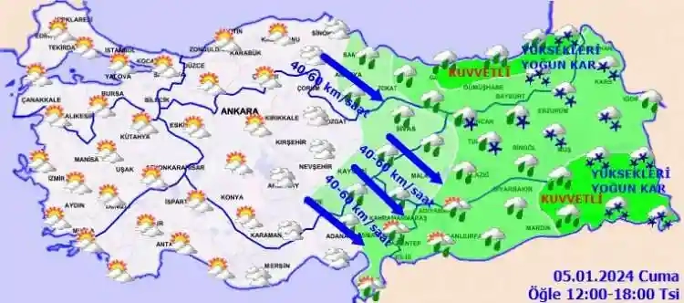 Meteoroloji'ye göre, Genellikle yağmur ve sağanak, Doğu Karadeniz'in iç kesimlerinde, Doğu Anadolu'nun kuzeyinde ve doğusunda karla karışık yağmur ve kar şeklinde görülecek yağışların Giresun, Rize ve Artvin çevrelerinde kuvvetli yağmur ve sağanak, Rize'nin ve Artvin'in yüksek ve dağlık kesimleri ile Şırnak'ın doğusu, Van'ın güneyi ve doğusu, Bitlis ve Hakkari çevrelerinde kuvvetli yüksek ve dağlık kesimlerinde yer yer yoğun kar yağışı şeklinde olması bekleniyor. İç kesimlerde sabah ve gece saatlerinde yer yer sis ve pus hadisesi bekleniyor.
