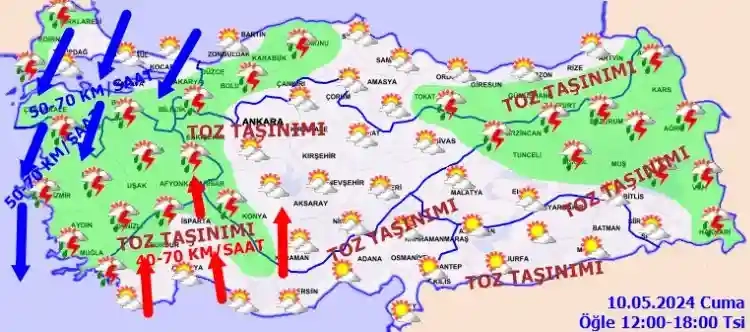 Ülkemiz genelinin parçalı yer yer çok bulutlu, Marmara, Ege, Batı Akdeniz, İç Anadolu'nun kuzeyi ve batısı, Karadeniz, Doğu Anadolu’nun kuzeyi ile Hatay, Osmaniye, Kahramanmaraş, Adıyaman, Gaziantep, Kilis, Elazığ, Van ve Hakkari çevrelerinin sağanak ve yer yer gök gürültülü sağanak yağışlı geçeceği tahmin ediliyor. Yurt genelinde toz taşınımı bekleniyor.