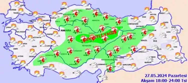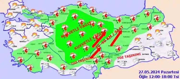 Meteoroloji Genel Müdürlüğü, 27 Mayıs Pazartesi gününe ilişkin hava tahmin raporunu yayımladı.