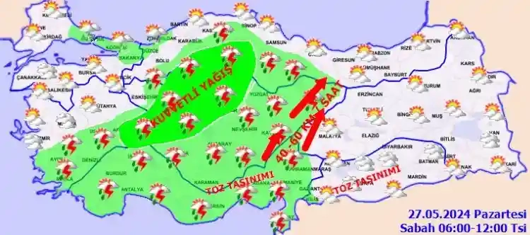 Yağışların; İç Anadolu , Orta Karadeniz'in iç kesimleri ile Afyonkarahisar ve Kastamonu çevrelerinde yerel olarak kuvvetli olması bekleniyor. Güney Doğu Anadolu'nun batısı ile Doğu Akdeniz'de toz taşınımı bekleniyor.