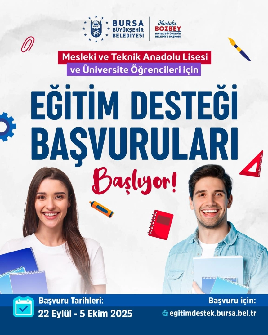 Okul öncesinden üniversite dönemi ve istihdam sürecine kadar öğrencilerin yanında olan Bursa Büyükşehir Belediyesi, 2025-2026 eğitim ve öğretim döneminde üniversite öğrencileri ile mesleki ve teknik Anadolu liselerinin öğrencileri için vereceği eğitim desteği başvurularını almaya başlıyor. Başvurular, 22 Eylül-5 Ekim tarihleri arasında belediyenin resmi eğitim destek platformu olan egitimdestek.bursa.bel.tr adresinden yapılabilecek ve sonuçları takip edebilecek. Yüksek lisans, doktora, açık öğretim ve uzaktan eğitim alan öğrenciler ise eğitim desteğinden yararlanamayacak.