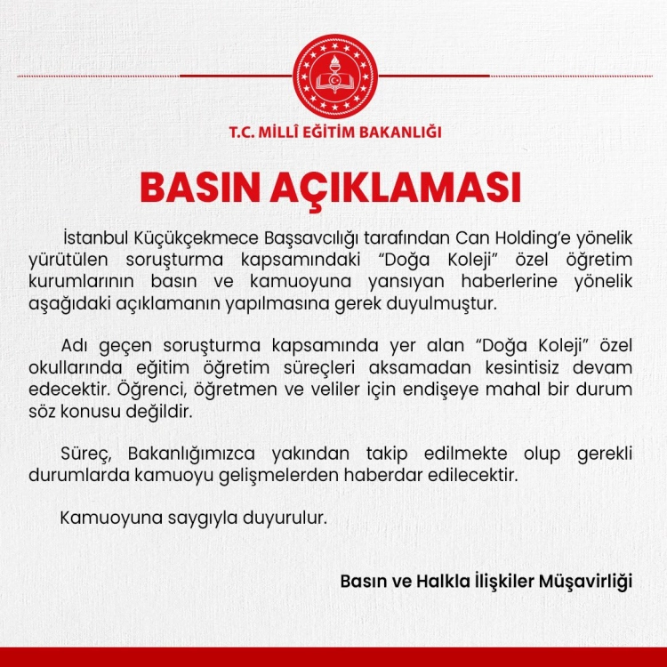 Bakanlıktan yapılan açıklamada, söz konusu soruşturma kapsamında yer alan 'Doğa Koleji' özel okullarında eğitim öğretim süreçleri aksamadan kesintisiz devam edeceğinin altını çizdi. "Öğrenci, öğretmen ve veliler için endişeye mahal bir durum söz konusu değildir" denilen açıklamada, "Süreç, Bakanlığımızca yakından takip edilmekte olup gerekli durumlarda kamuoyu gelişmelerden haberdar edilecektir" ifadeleri yer aldı.