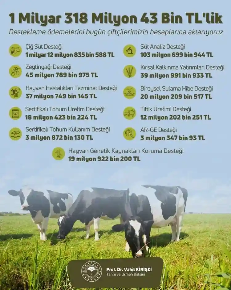 Bakan Kirişci sosyal medya hesabından yaptığı paylaşımda "1 milyar 318 milyon 43 bin TL’lik tarımsal destek ödemelerini bugün çiftçilerimizin hesaplarına aktarıyoruz. Hayırlı ve bereketli olsun" diyerek, destek tutarlarının detaylarını da açıkladı.