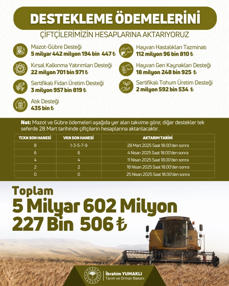 5 milyar 602 milyon 227 bin 506 lira tarımsal destekleme ödemesi bugün itibariyle çiftçilerin hesaplarına aktarılmaya başlandı. TC Kimlik Numarasının son hanesine göre yapılacak ödemelerin son aktarım tarihi 25 Nisan olarak duyuruldu.