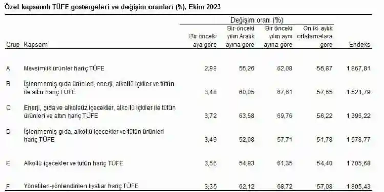İşlenmemiş gıda ürünleri, enerji, alkollü içkiler ve tütün ile altın hariç TÜFE'deki değişim, 2023 yılı ekim ayında bir önceki aya göre yüzde 3,48, bir önceki yılın aralık ayına göre yüzde 60,05, bir önceki yılın aynı ayına göre yüzde 67,61 ve on iki aylık ortalamalara göre yüzde 57,65 olarak gerçekleşti.